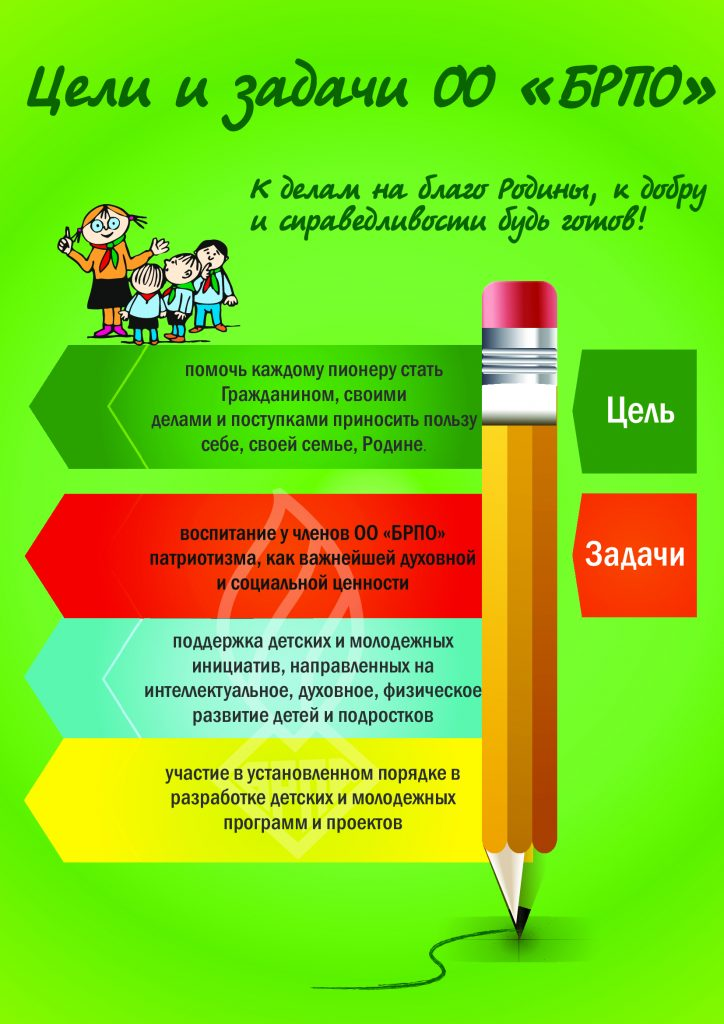 Цель ОО «БРПО» – помочь каждому пионеру стать Гражданином, своими делами и поступками приносить пользу себе, своей семье, Родине.