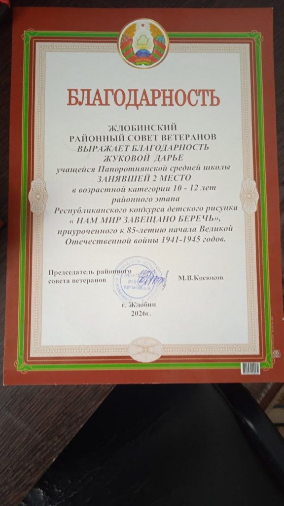 ПОЗДРАВЛЯЕМ учащуюся 8 класса ЖУКОВУ ДАРЬЮ, занявшую 2 место в районном этапе открытого Республиканского конкурса детского рисунка «Нам мир завещано беречь».