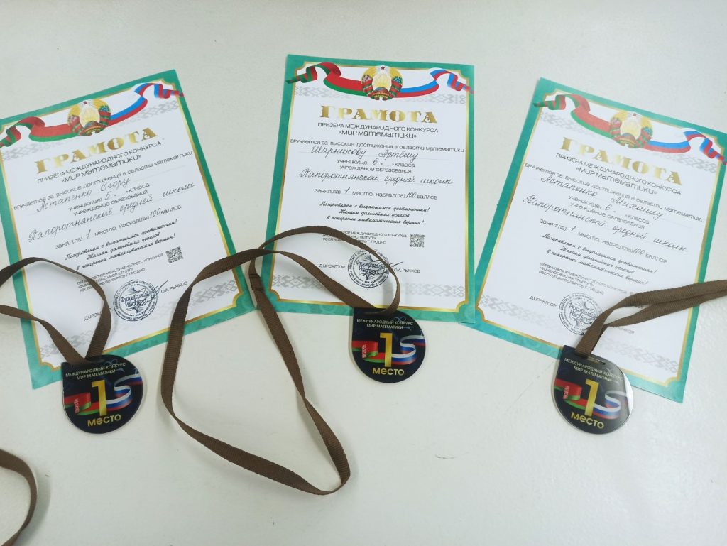 ПОЗДРАВЛЯЕМ учащегося 5 класса АСТАПЕНКО ЕГОРА, учащихся 6 класса АСТАПЕНКО МИХАИЛА и ШАРНИКОВА АРТЕМА, занявших 1 место в международном конкурсе по математике «МИР МАТЕМАТИКИ»